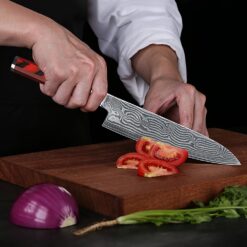 This 8 inches Damascus chef knife has super-sturdy 10Cr15 blade, hold an edge well, and have the perfect balance when it comes to grip and weight.