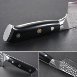 Hammer clad Damascus steel – the hard Japanese VG-10 steel is clad in a softer Damascus steel in order to give the blade an added toughness and durability. The hammered texture of the blade eliminates friction and keeps food from sticking to the blade.