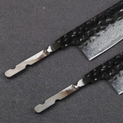 This is a Japanese petty knife blade. The blade is forged with 66 layers of steel clamped to a high carbon VG10 core. The blade is heat treated to a hardness of 60 degrees.