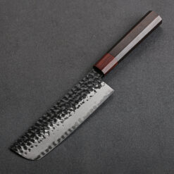 The 7″ premier nakiri knife features layered steel (3-ply high carbon steel with 440C cutting core) with a hand-hammered finish known as tsuchime in Japanese. The hand-hammered finish prevents food from sticking onto the blade and eliminates drag when cutting, making this the best Japanese nakiri knife.