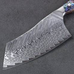 The blade is made out of durable 67 layers SUS410 Damascus steel with super VG-10 cutting core that has been individually ground and honed. The Cleaver is great for chopping through bone and all types of meat. The blade to handle seal is impervious making the Cleaver extremely sanitary. Great for restaurants, cafes and catered events.