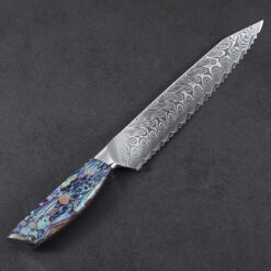 This one is made with Damascus steel with Japanese VG-10 super cutting core which has been heat treated and ice-hardened for exceptional sharpness and less-frequent sharpening, as well as for easier sharpening when needed.