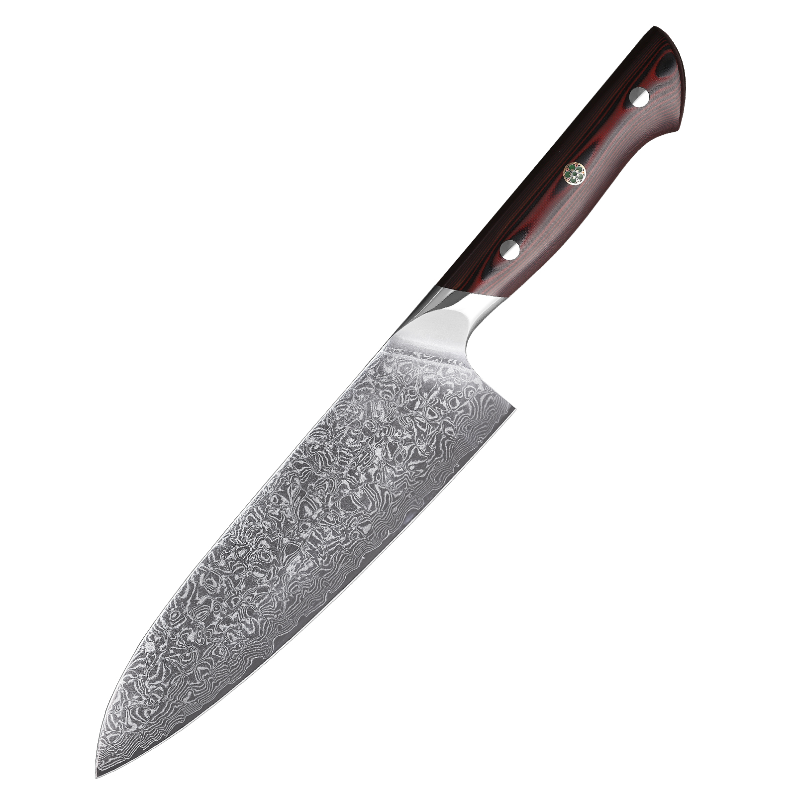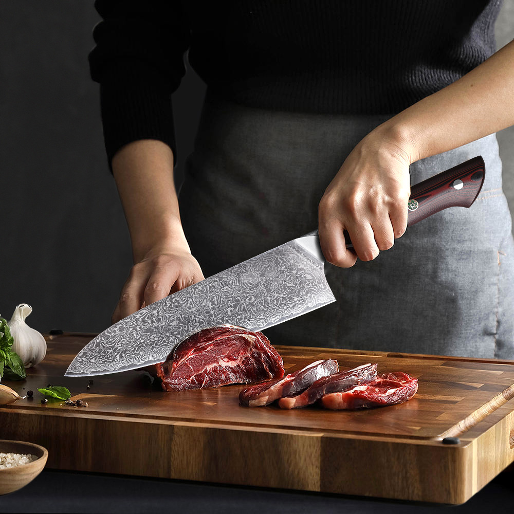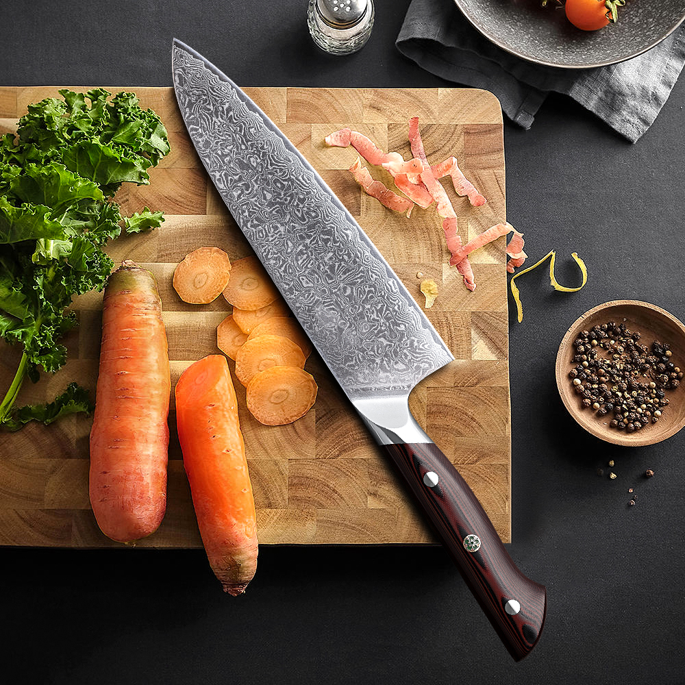 Crafted for performance and style, this chef knife features a 67-layer VG1O Damascus steel blade with a sloped bolster and full tang construction for superior balance and control.