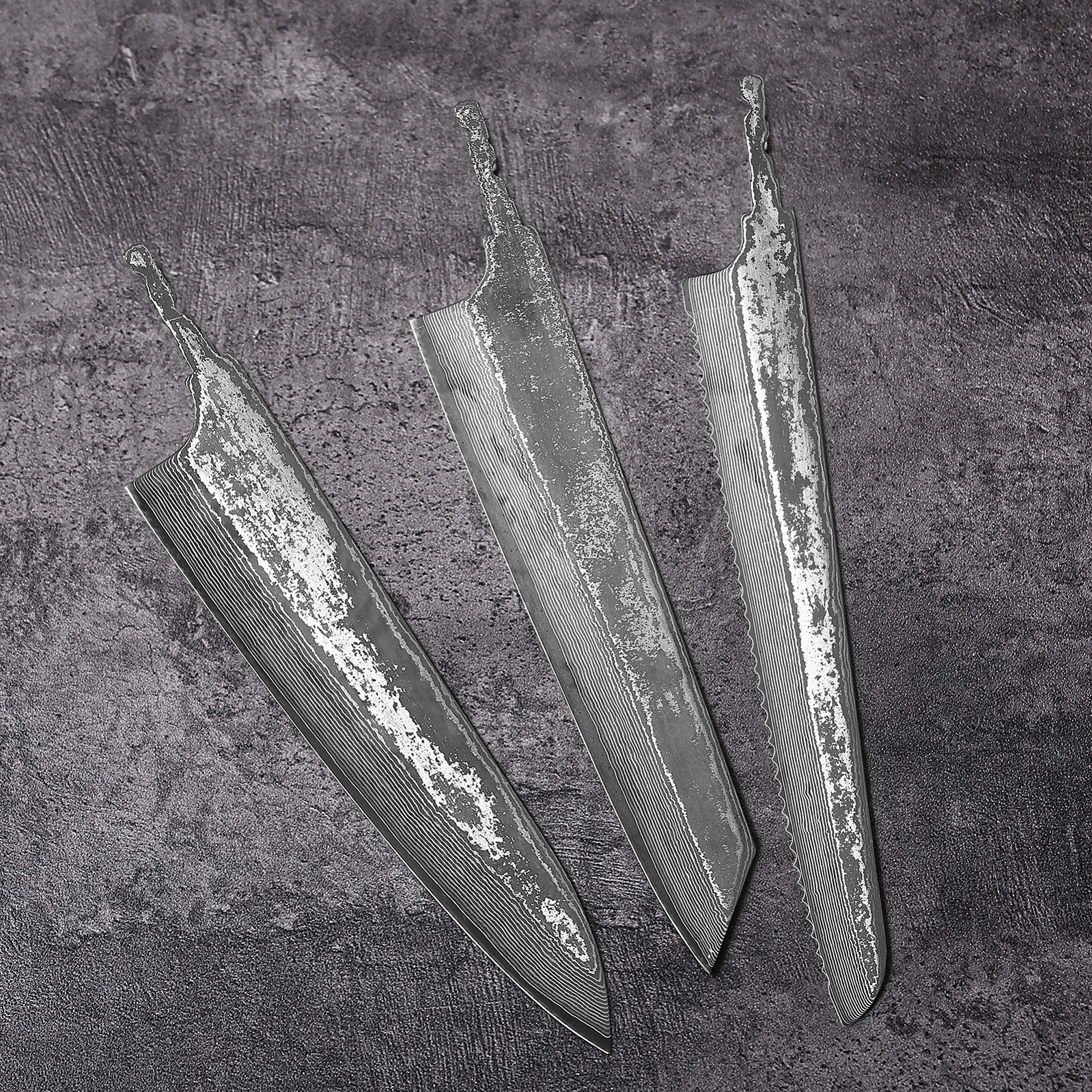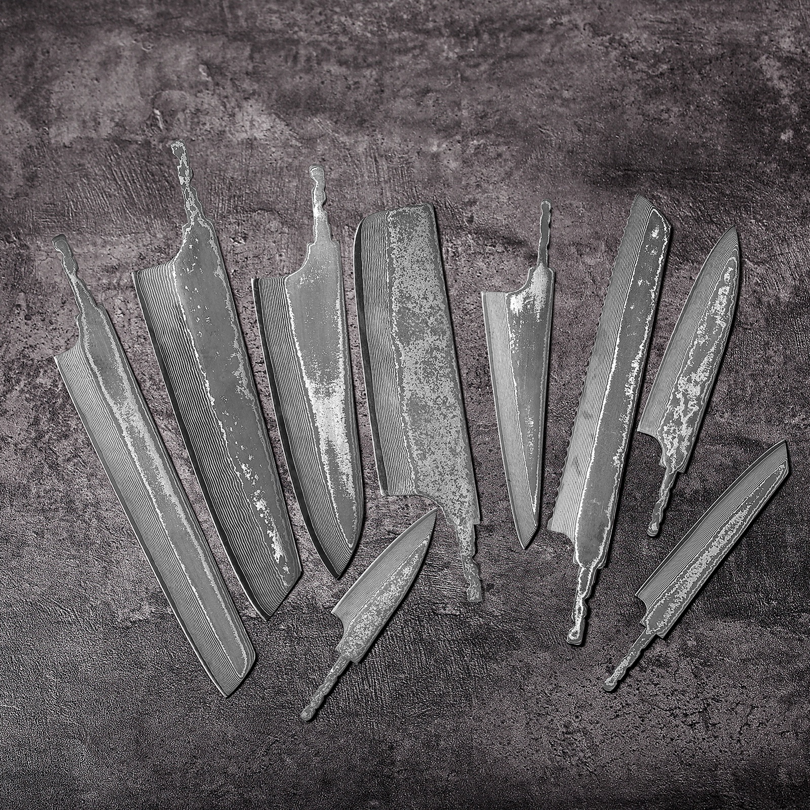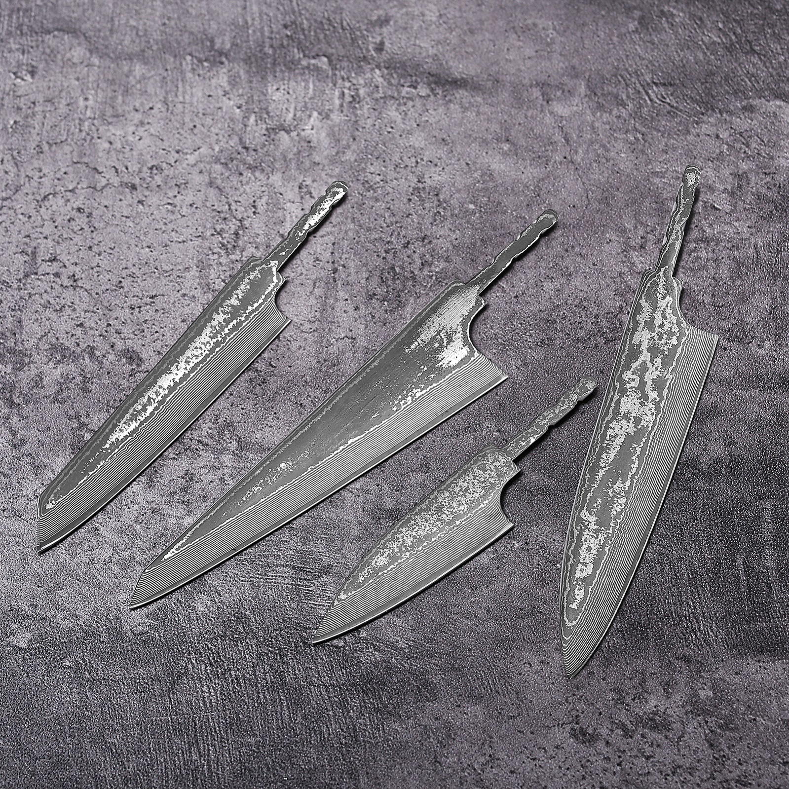 This is our new premium collection of Japanese knife blade blanks, designed for both professional and aspiring chefs. Crafted from high-quality forged AUS-10 Damascus steel, these blades offer exceptional durability and performance. Each blank features a partial tang construction, ensuring a perfect balance and control during use.