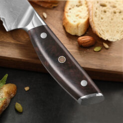 This premium kitchen bread knife is crafted with precision and style, featuring a full tang design and a durable black wood handle secured with 3 rivets for superior balance and comfort. The blade is made from authentic Damascus steel, renowned for its strength, sharpness, and stunning pattern.