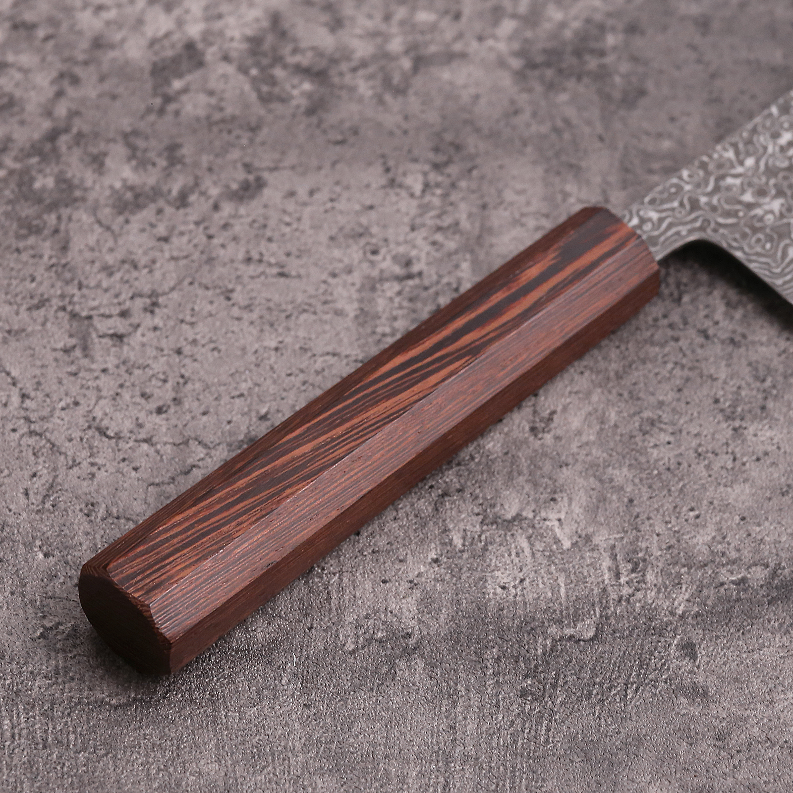 The wenge wood wa-handle completes the picture. Dark, dense, tight-grained — wenge has a natural visual weight that matches the nakiri’s broad blade. The octagonal profile sits differently in the hand than a Western handle: lighter grip pressure, more control at the fingertips, less fatigue during long prep sessions. For any kitchen doing serious vegetable work, this combination of flat blade geometry and Japanese handle design is not a preference — it is a meaningful upgrade in how the work feels.