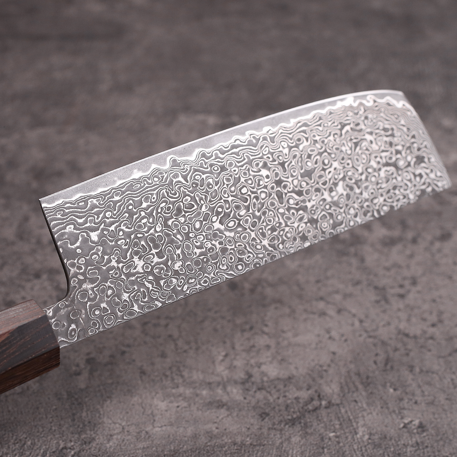 The Damascus pattern on this nakiri has a different visual character to a gyuto or bunka — the wide flat blade gives the layered steel more surface area to show, making the flowing Damascus pattern more dramatic and visible. In a retail display or product photograph, the nakiri stops people. It looks unlike any knife most buyers have seen before.