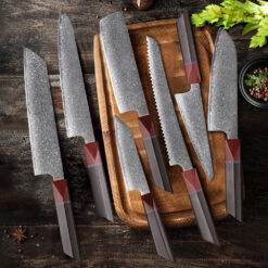 We have specialized in the production of Japanese kitchen knives for over 20 years, meticulously selecting high-quality steel such as VG10 and AUS-10. Additionally, our knives feature black wood as the handle material.