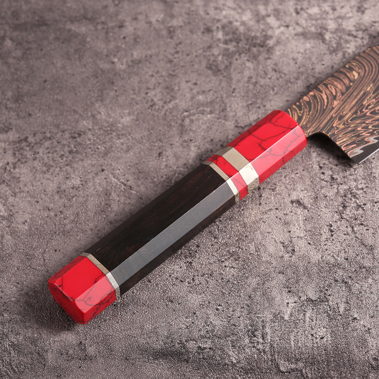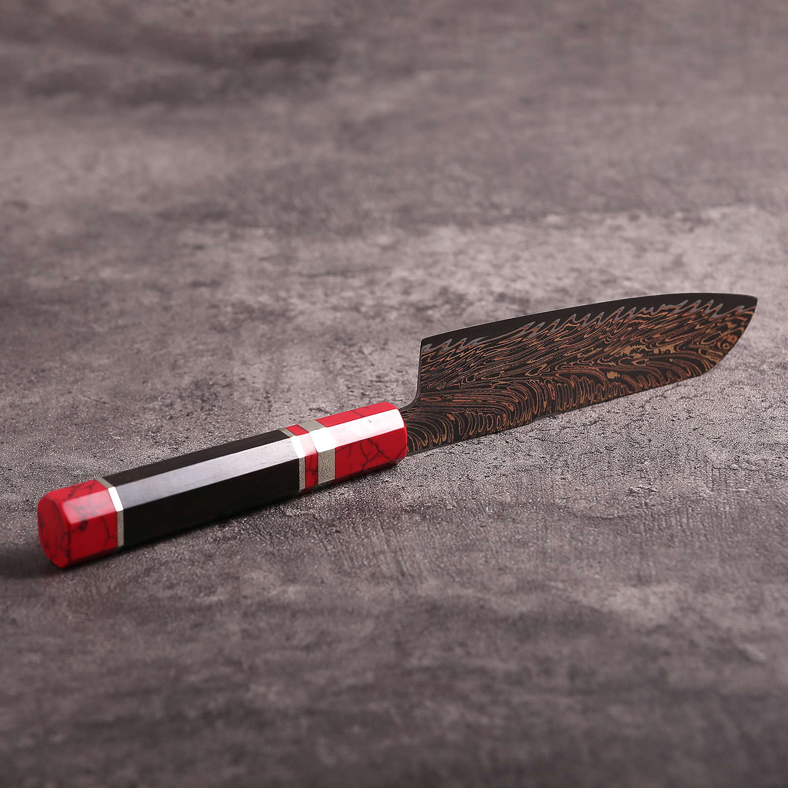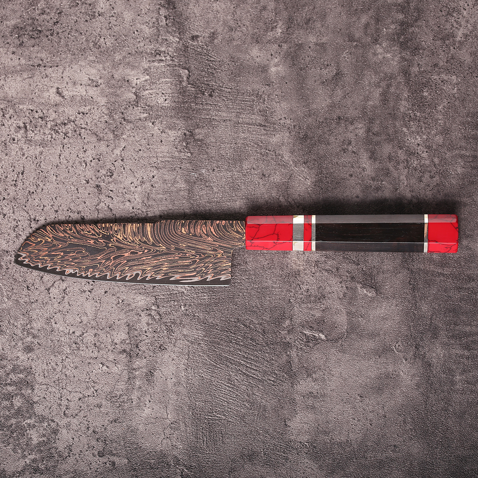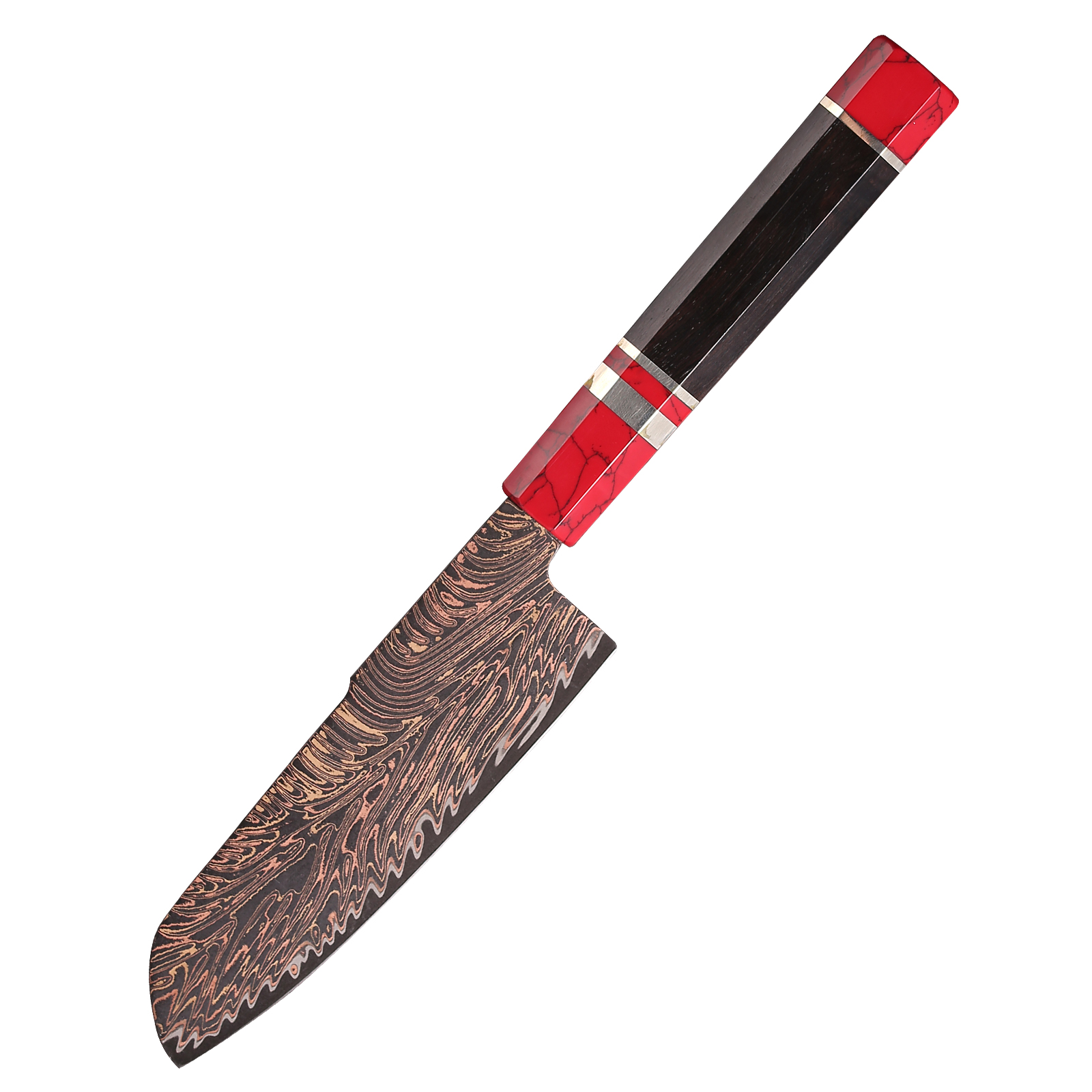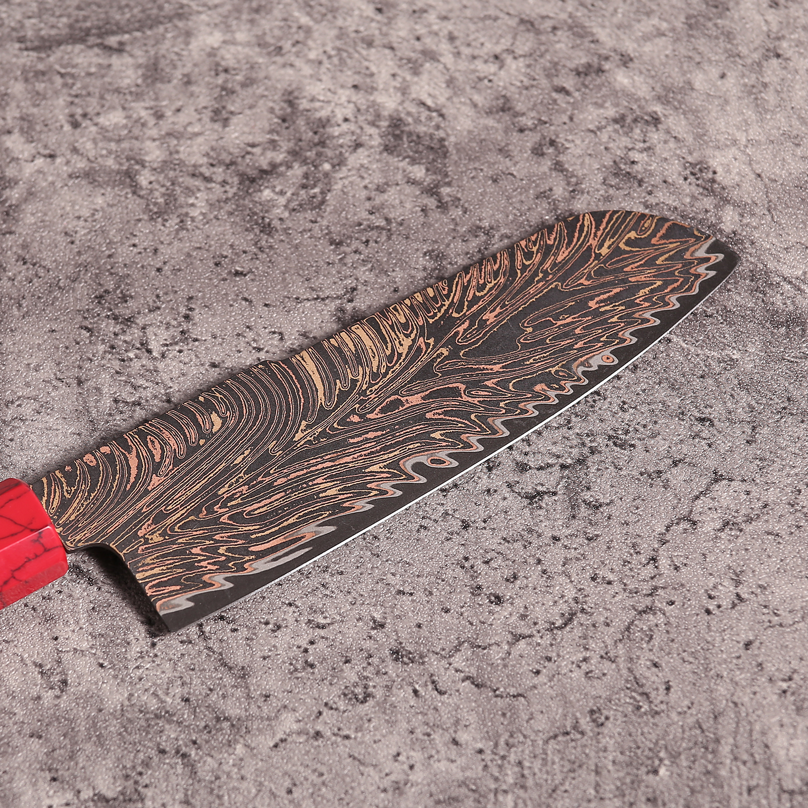 The samll size Santoku Knife (125mm) is crafted from copper mai Damascus steel, combining striking aesthetics with chef‑grade performance. Its blade delivers precise chopping, slicing, and dicing, while the stick tang construction ensures balance and durability.